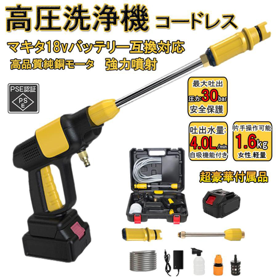 - 高圧洗浄機 充電式 コードレス バッテリー*1 充電器*1 マキタ 18vバッテリー互換対応 吐出圧力3MPa 強力噴射 小型 大容量 pse認証済み