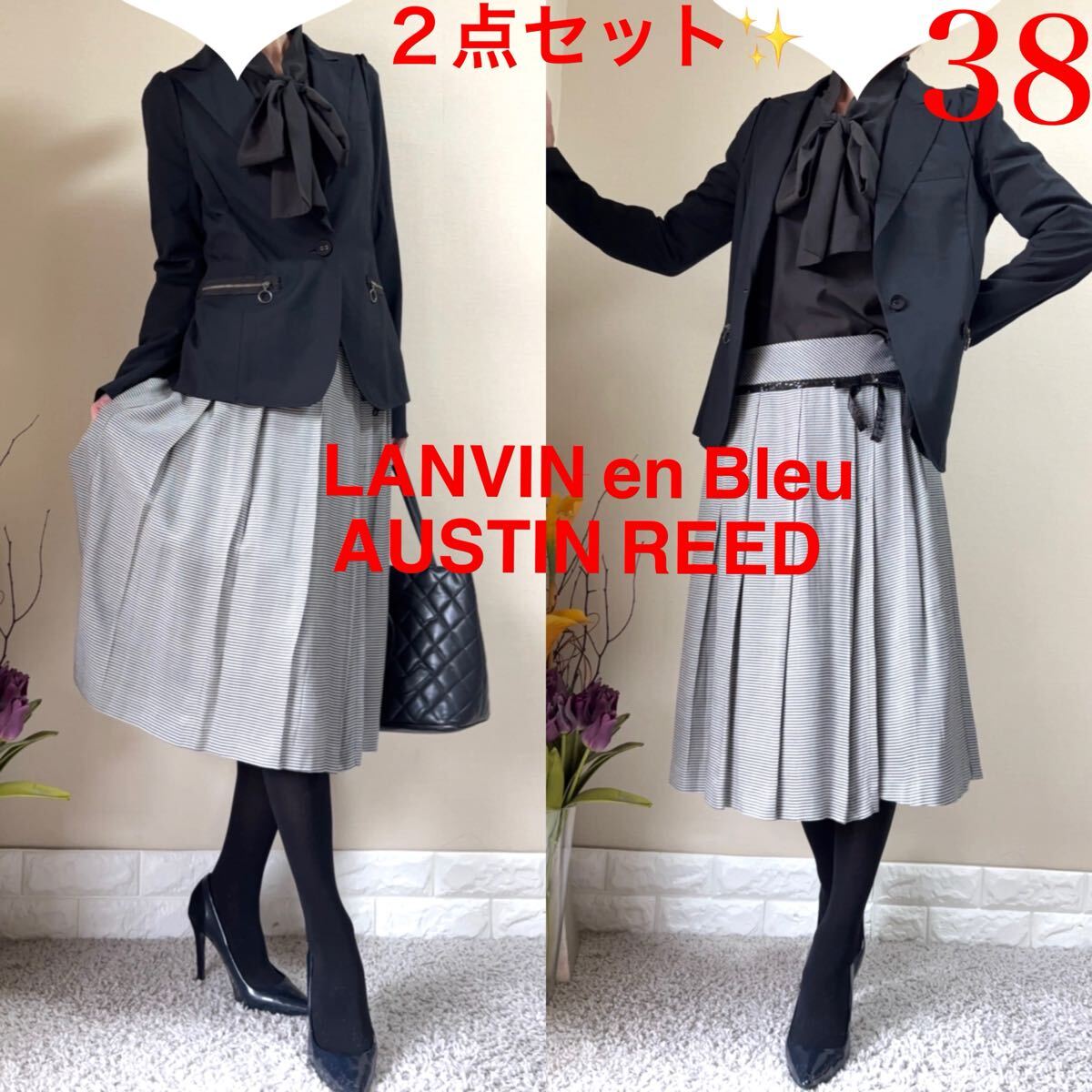 > M スーツ!ランバン LANVIN en Bleu ジャケット オースチンリード AUSTIN REED ウエストリボン プリーツスカート 黒 春夏秋 38
