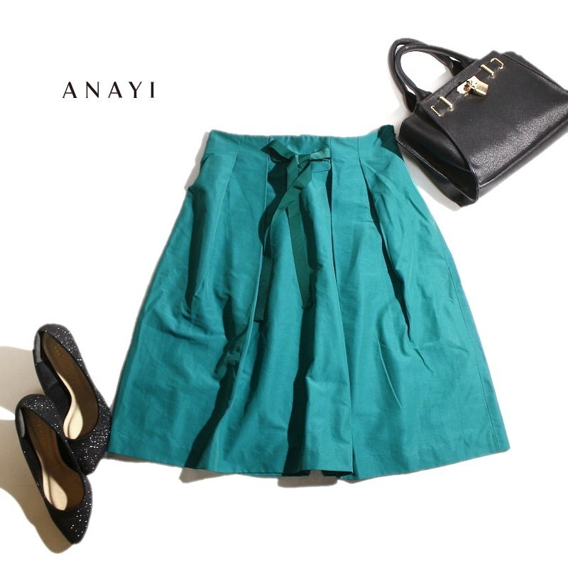 - 美品 ANAYI アナイ 春 夏 ほんのり艶 きれい色 コットン ポリエステル Aライン フレアスカート 9号 38 グリーン 青緑 日本製 お洒落 可愛い