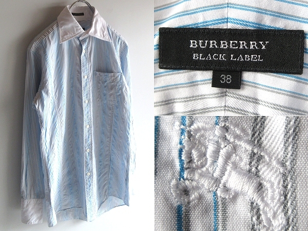 > BURBERRY BLACK LABEL バーバリーブラックレーベル ホースロゴ刺繍 クレリック ストライプシャツ 38 ホワイト グレー ブルー ネコポス対応