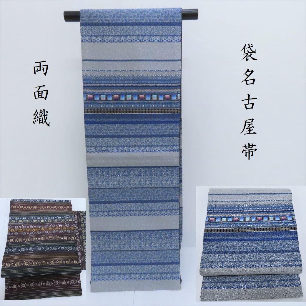 - Club藤★名古屋帯 両面リバーシブル 藍色 眼鏡縞紋 カジュアル 袋名古屋帯 御仕立上り ガード加工 (3396)