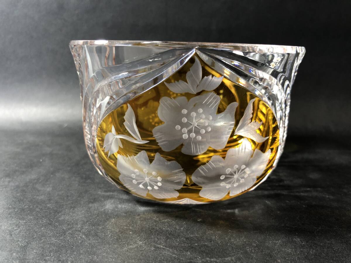 - 西洋ガラス ボヘミアンガラス 黄色被せガラスに桜の花文様 ガラス鉢 ガラスボール ガラス雑貨 テーブルコーディネート
