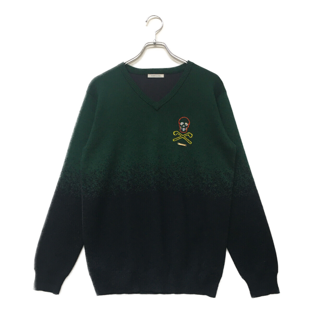 > coco 中古【値下げ】マークアンドロナ メンズ セーター M 緑×紺 長袖クルーネック ラインストーン レターパックプラス発送可K010258