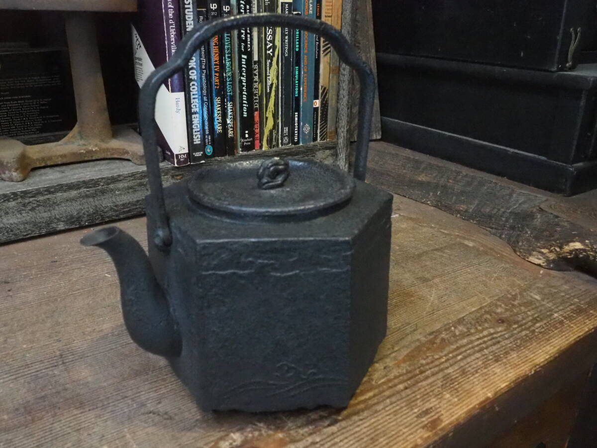 - 【六角の鉄瓶】南部鉄瓶古道具アンティーク骨董やかん鉄釜古民具箪笥インテリア囲炉裏ポット自在鉤錠前鉄鍋薪ストーブ茶道ケトル古道具
