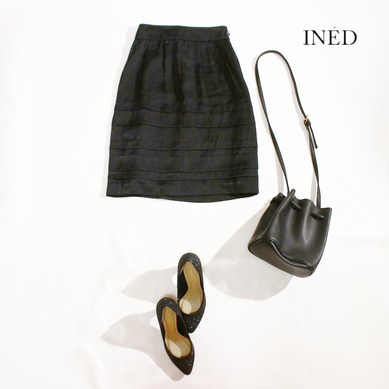 - 美品 イネド INED 株) フランドル 春 夏 上品 艶 クラッシック 広がりのない段フリル Aライン ギャザースカート 7号 ブラック 黒 スカート