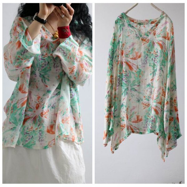 - jm Vネック チュニック 花柄 トップス アンティーク風 ロマンファッション ゆったり 麻100% 柄1