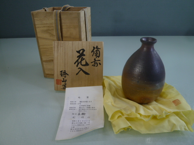 > 備前焼 花入 紀シュウ山 中古 花瓶 一輪挿し 華道 茶道 桐箱入り 共箱共布付 昭和レトロアンティーク