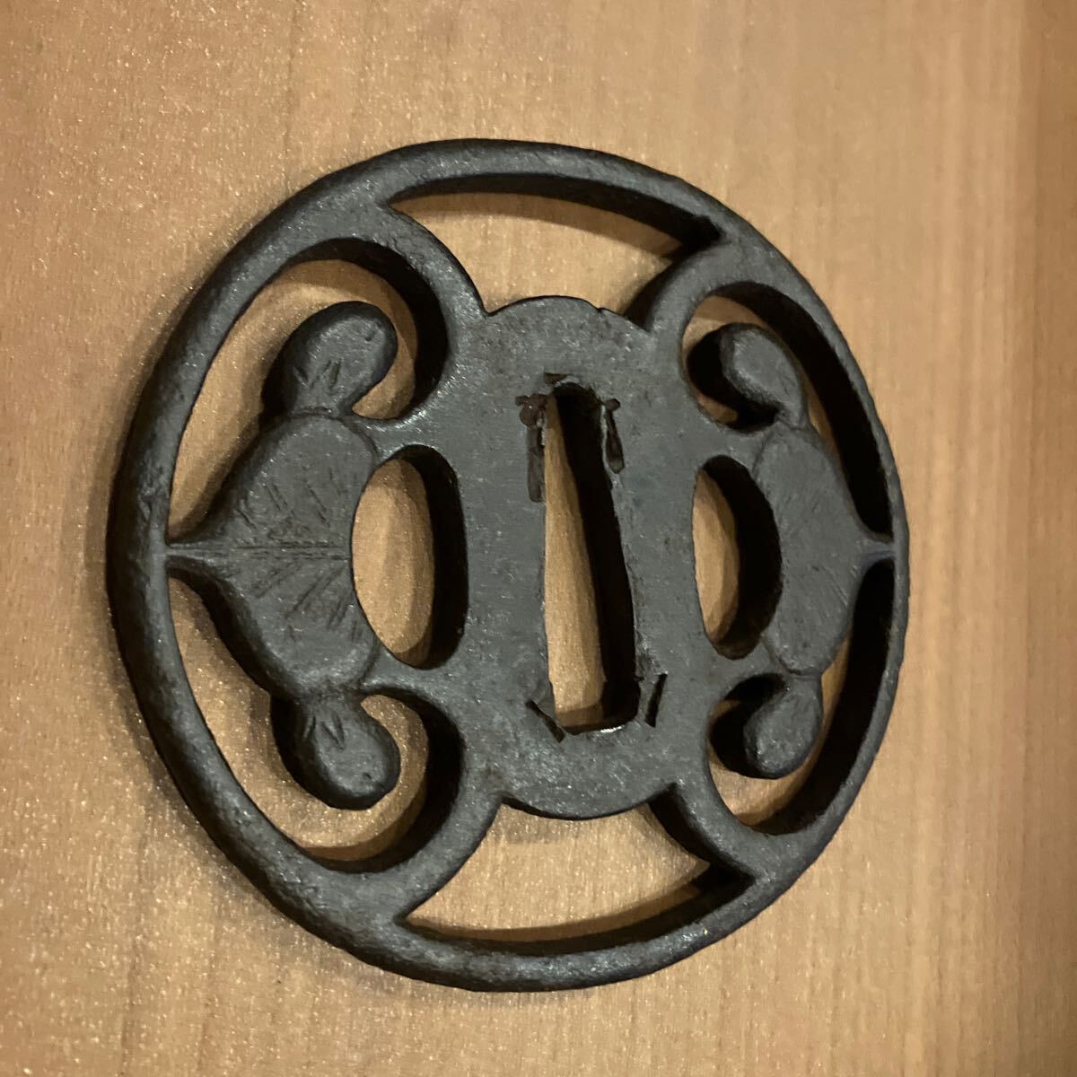 - 骨董 アンティーク コレクター 鍔 つば 刀装具 日本刀 年代物 葉紋図 SAMURAI 侍 サムライ 蚤の市 武具 年代物