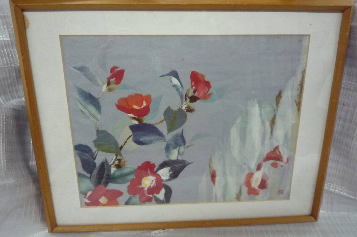 - 寒椿の貼り絵/額込みの大きさ/54x42㎝/刻印有り