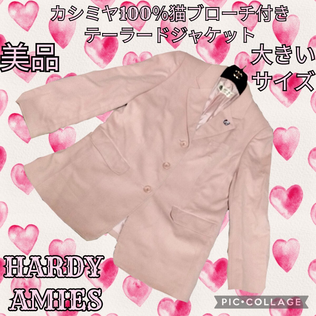 > 美品★ハーディエイミス★カシミヤ100%★ジャケット★ピンク色★猫ブローチ付き★ビジュー★HARDY AMIES★テーラード★ミドル丈★春秋冬
