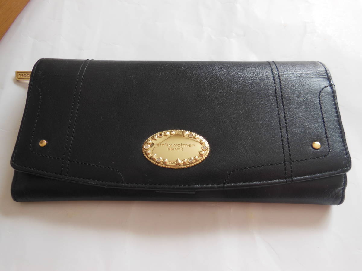 - 未使用に近い PINKY WOLMAN ピンキーウォルマン 女性用長財布・小銭入れあり 本革 ブラック×ゴールド金具 送料無料