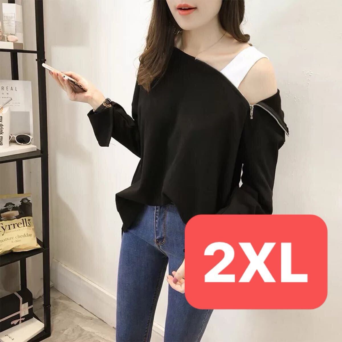 > オフショルダー パーカー 2way ジップ 長袖 トップス フード プルオーバー トレンド ストリート セレブ 人気 キレイ ブラック 黒 2XL