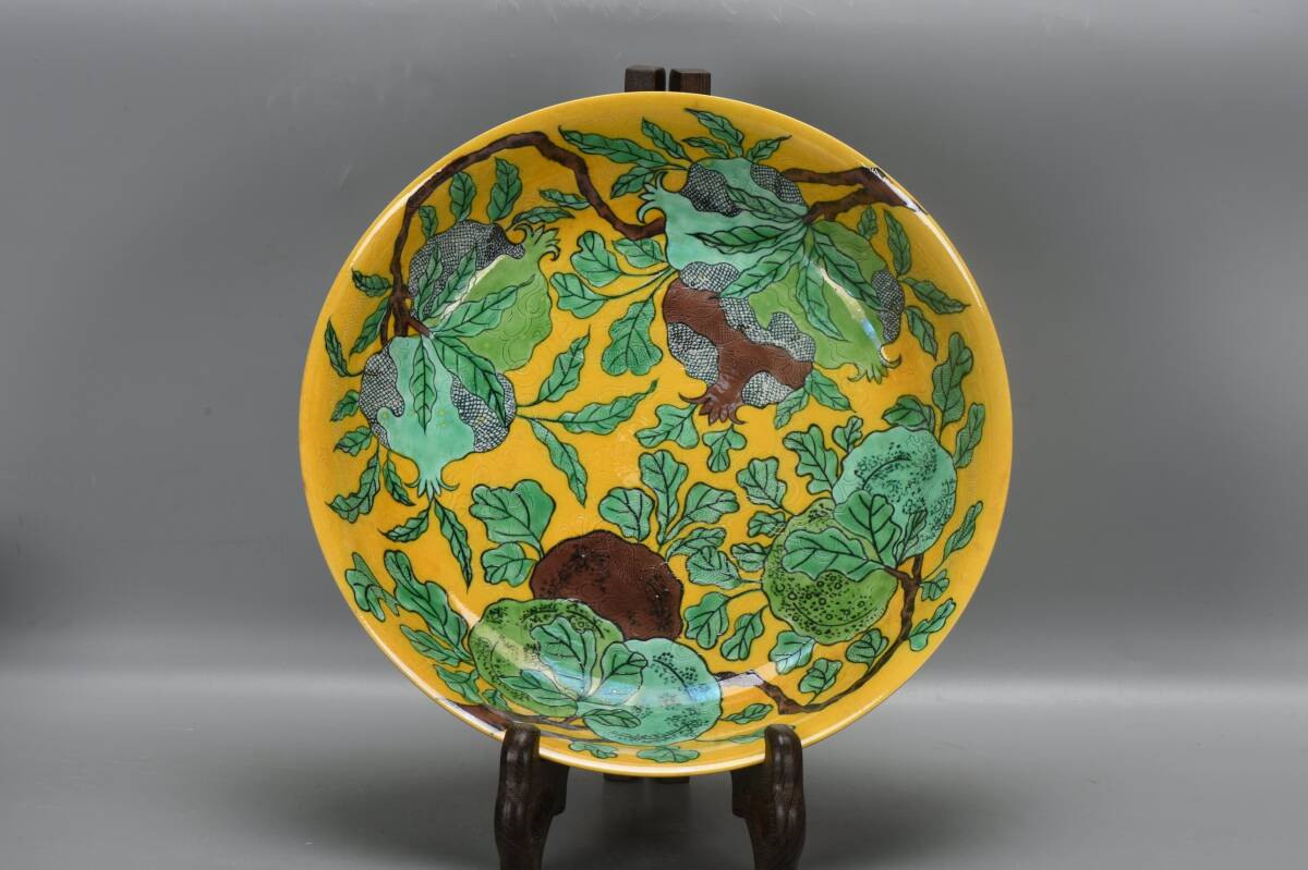- ◆旧家蔵出◆古美術 中国古玩 大清康熙年製款 素三彩 暗刻龍紋石榴図大盤 置物 擺件 古賞物 骨董 時代物 A04
