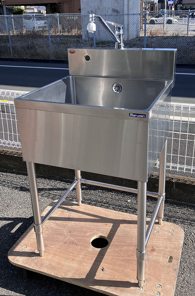 - 即決 マルゼン 一槽シンク 幅600 奥行600 高さ870+150mm ステンレス 三方枠 シングルレバー混合栓 横引トラップ バックガード付 中古