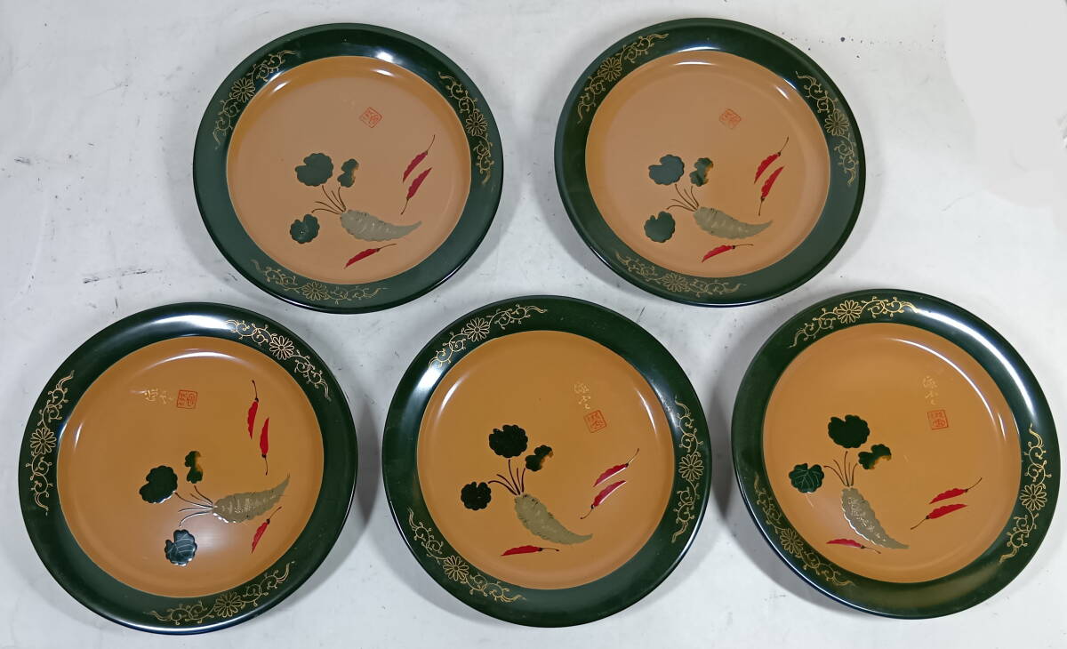 - ちょい古の輪島塗 木製 野菜の絵 刺身皿 5人前