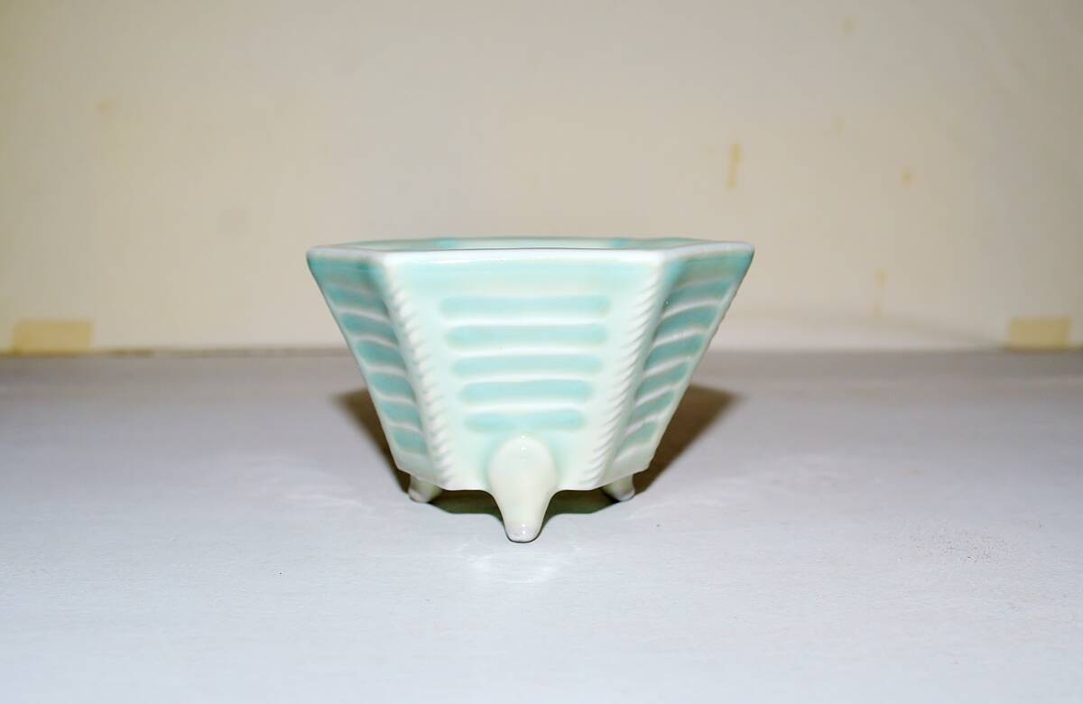 - 特注品・希少・伊藤月香の弟さん 「伊藤屯洋」 青磁釉に紋様図 猫足六角形の鉢