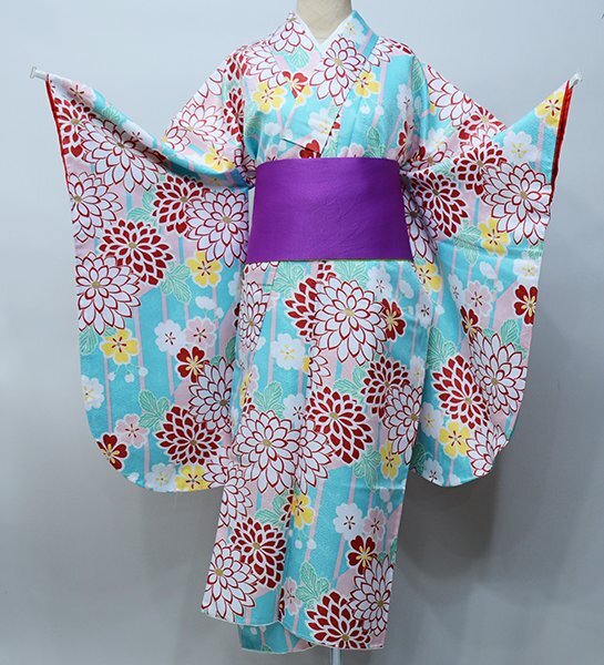 > 二尺袖 着物 単品 仕立て上がり H・L 小紋柄 百花繚乱 着物丈は着付けし易いショート丈 合繊 水色 新品(株)安田屋 NO39934 NO25383