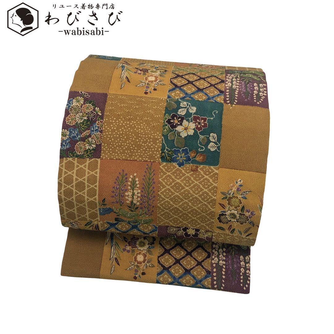 > 名古屋帯 格子柄 花草模様 縮緬 狐色 O-4863 着物 きもの kimono 和服 和装 中古 リサイクル着物 【送料無料】