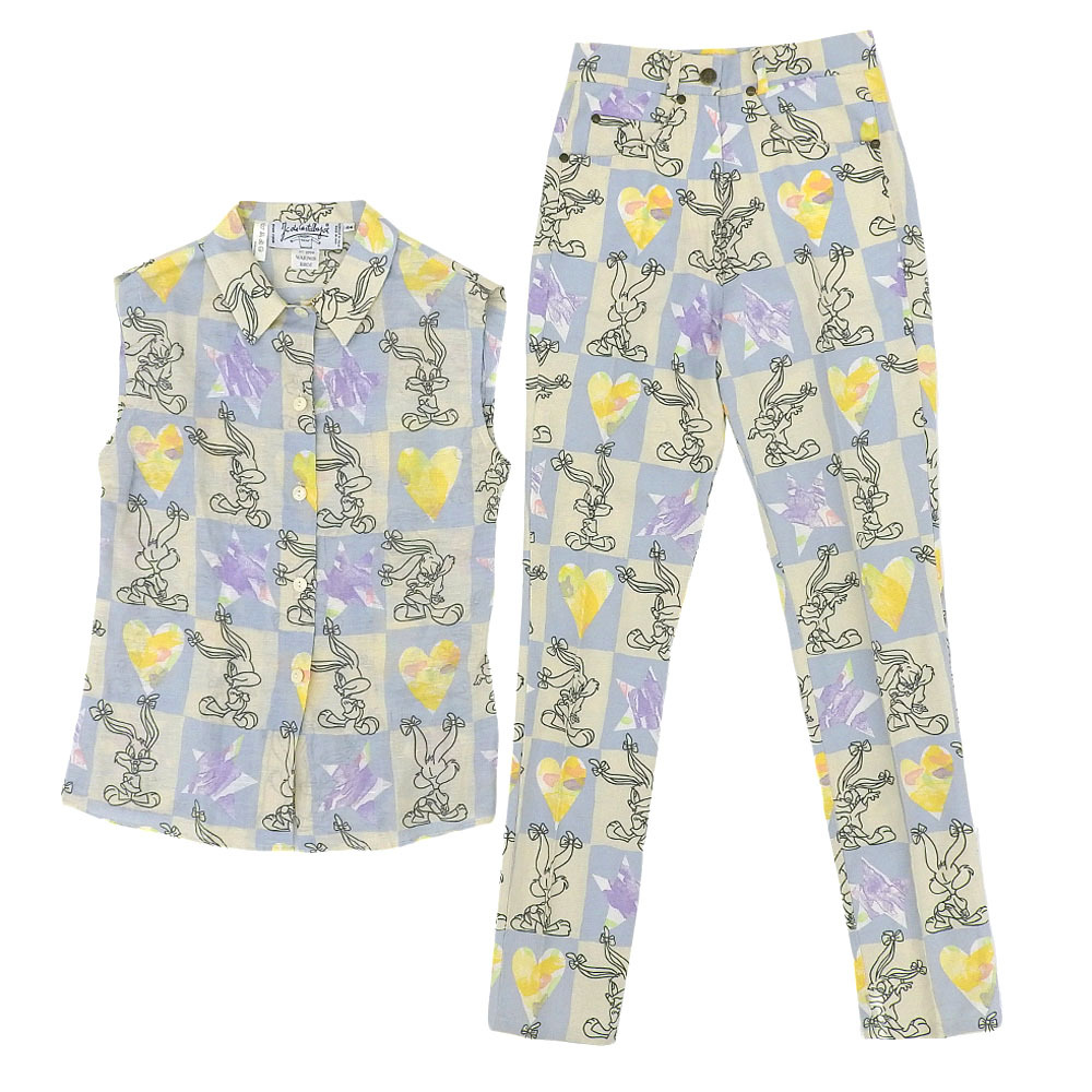 - CASTELBAJAC カステルバジャック WARNER BROS 1994 総柄 セットアップ レディース リネン×コットン ブルー×ベージュ 44 40 ヴィンテージ