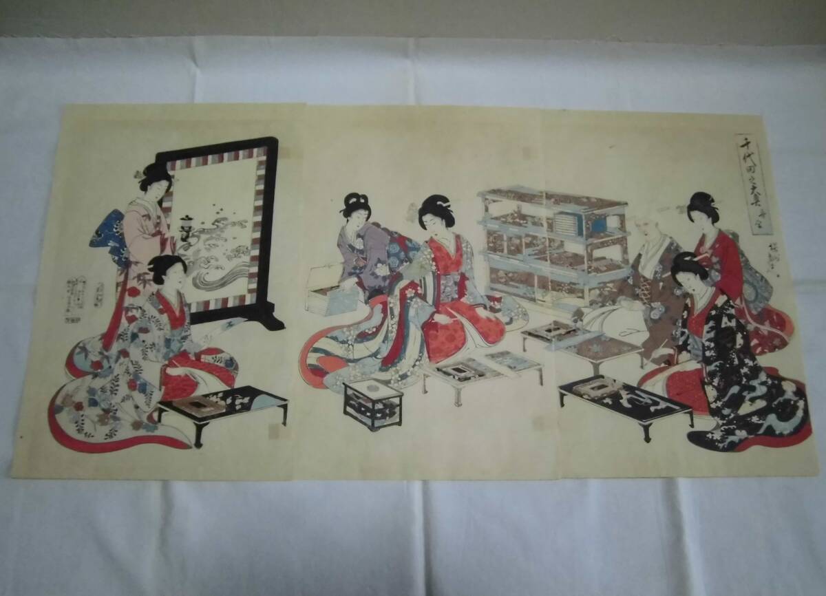 - 木版画 浮世絵 楊洲周延 千代田の大奥 歌会 三枚続 大判 橋本直義 明治 貴重 希少 美人画 美術品 時代物 レトロ