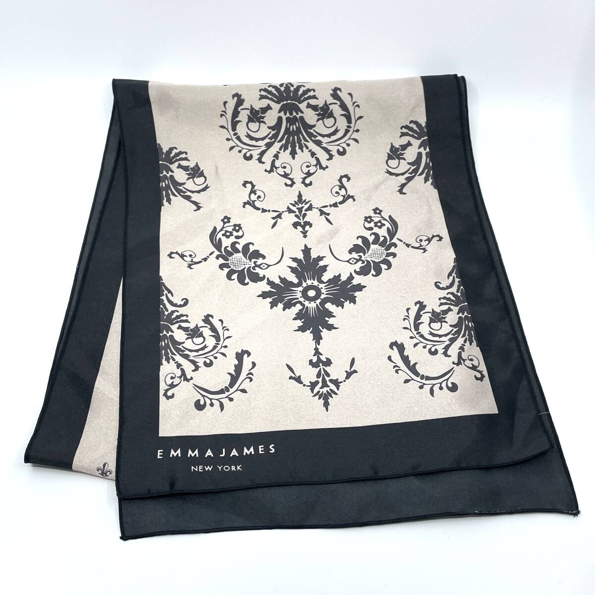 - EMMAJAMES エマジェイムス ストール ロングスカーフ ブラック×グレージュ 花 フラワー クロス シンメトリー 光沢 ラグジュアリー
