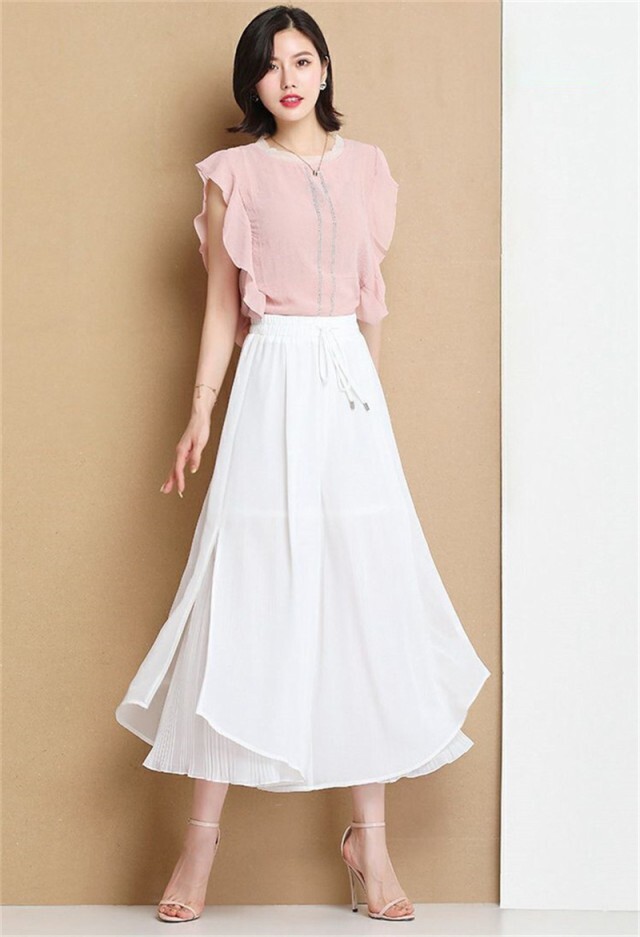 - ガウチョパンツ 裾プリーツ 切り替え ワイドパンツ レディース シフォン フレアパンツ スカーチョ ゆったり ホワイト M