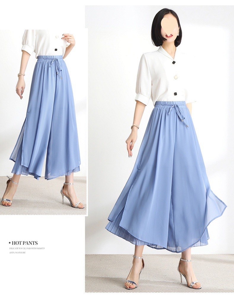 - ガウチョパンツ 裾プリーツ 切り替え ワイドパンツ レディース シフォン フレアパンツ スカーチョ ゆったり ブルー 4XL