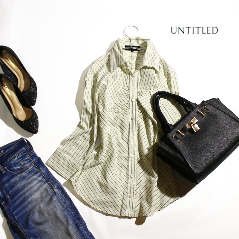 > 美品 アンタイトル UNTITLED 株) ワールド 春 夏 ラメ ストライプ柄 Vネック シャツ 1 ホワイト グリーン 緑 オフィス 通勤 綺麗め