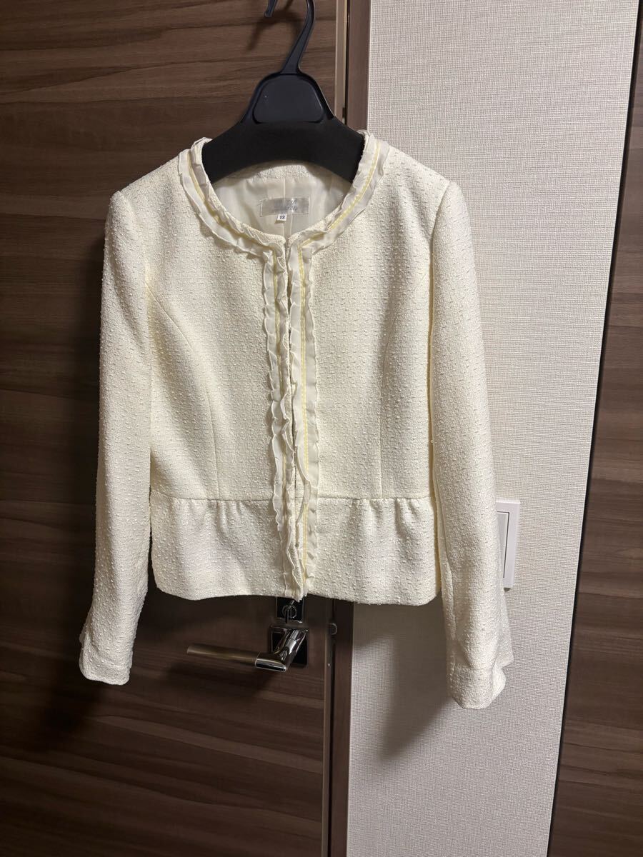 - 美品着用数回 オフホワイト ノーカラージャケット すてきフリル 大きい 卒業入学式フォーマルスタイルに 即決あり