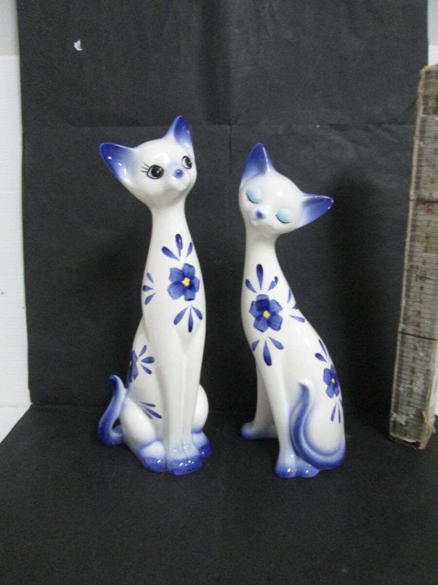 - 猫の置き物ペア 寄り添いネコ シャムネコ H27㎝ 陶器 インテリア 美品小の猫の耳に少し剥げありよくみて