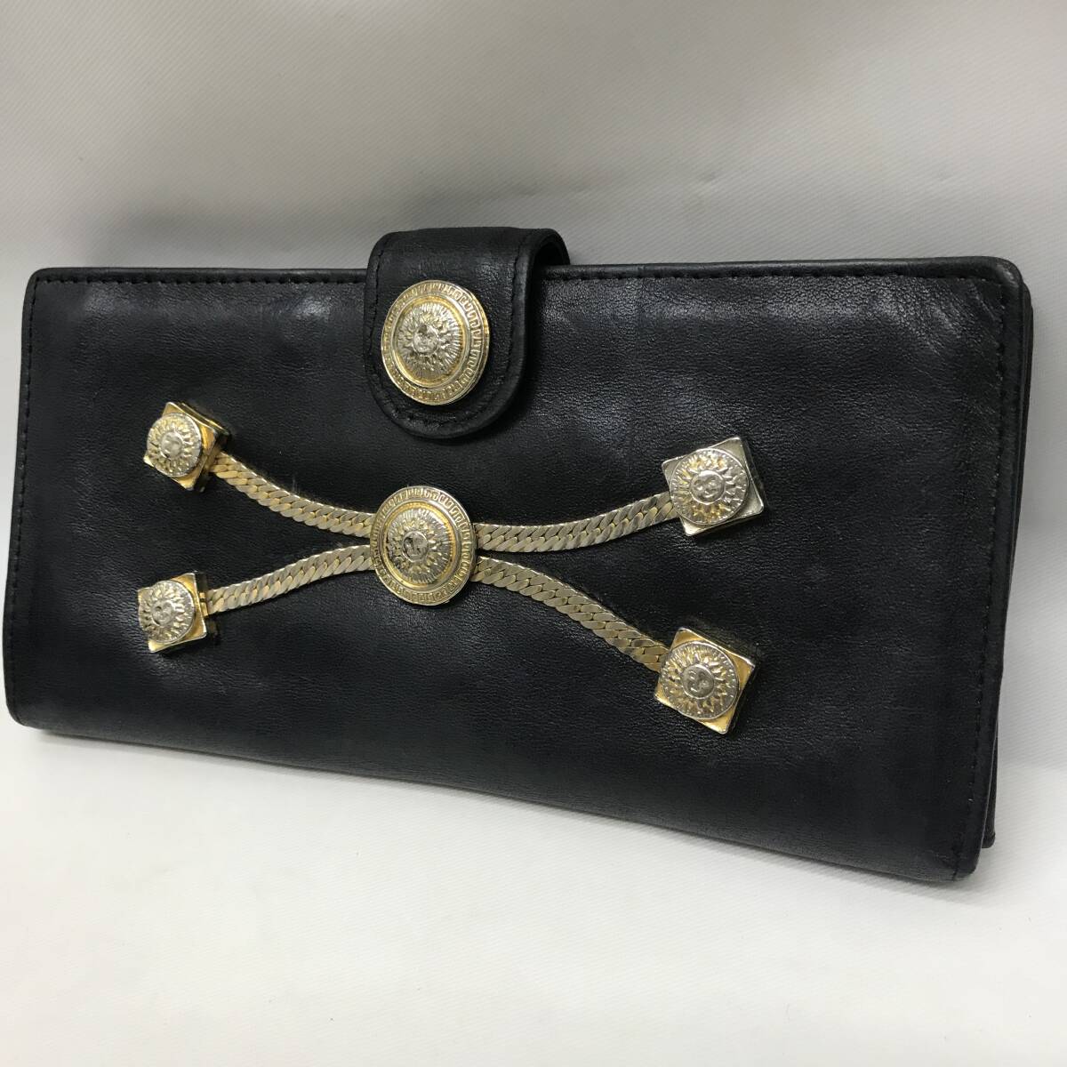 - GIANNI VERSACE 長財布 ベルサーチ レザー ブラック 太陽 サン パスケース ダークネイビー 紺系