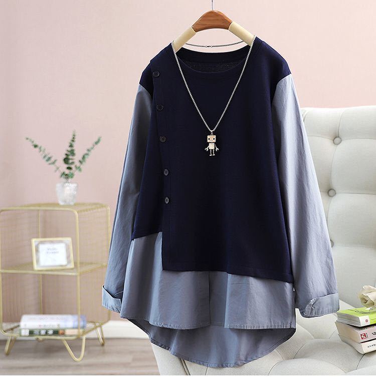 - ブラウス レディース トップス ドッキングブラウス ニット 重ね着風 春秋 ゆったり 丸首 長袖 大きいサイズ きれいめ LUEA208(L-4XL)