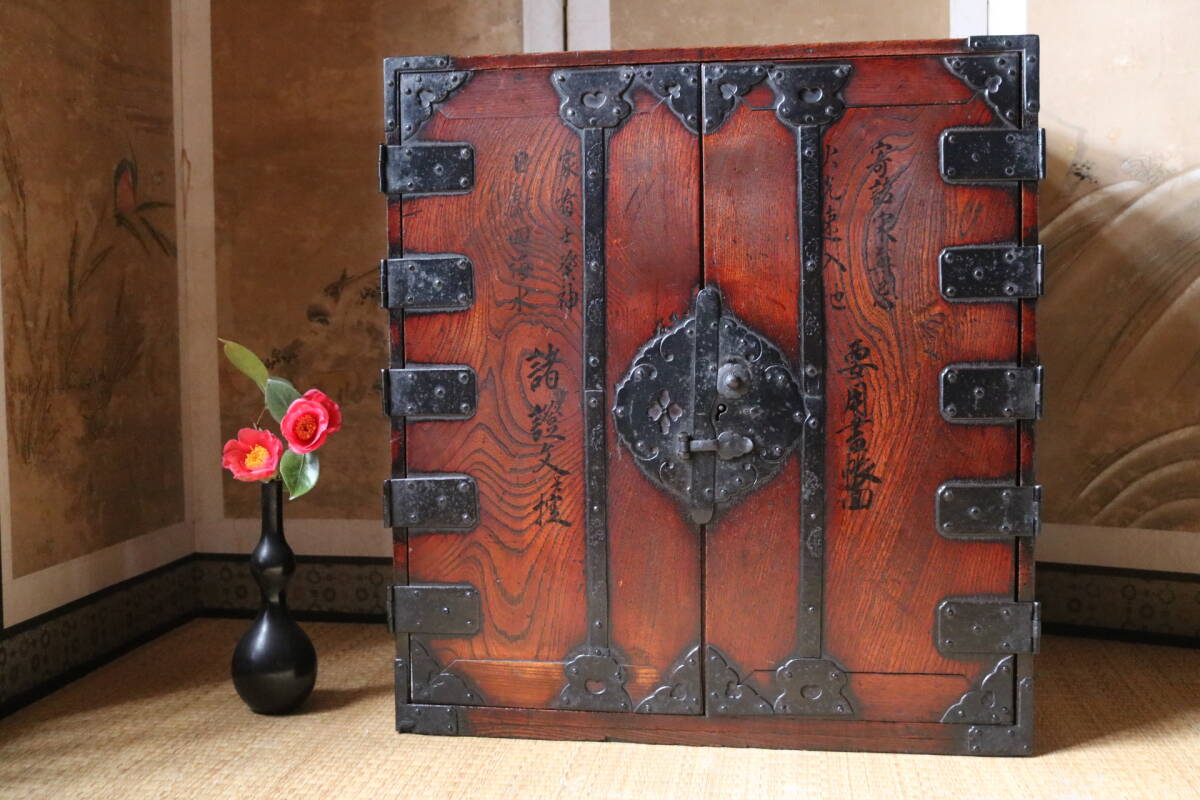 > 【伊董】C42.古民芸!珍品!希少!古い時代箪笥山形県庄内地方古鉄金具観音開帳場箪笥総欅中桐江戸文化二年 #骨董品 船箪笥 #金庫箪笥