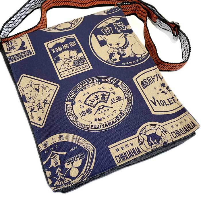 - デニムショルダーバッグ 看板柄 紺色 倉敷デニムバッグ 昭和レトロ柄 和風デニムバッグ 未使用新品