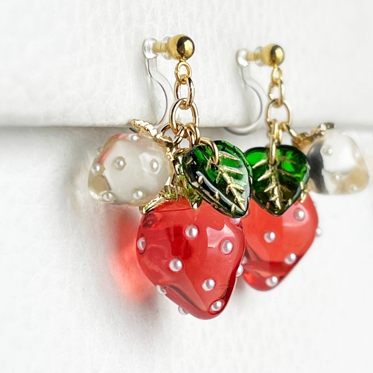 - 可愛いイチゴのノンホールピアス*赤L・クリアS