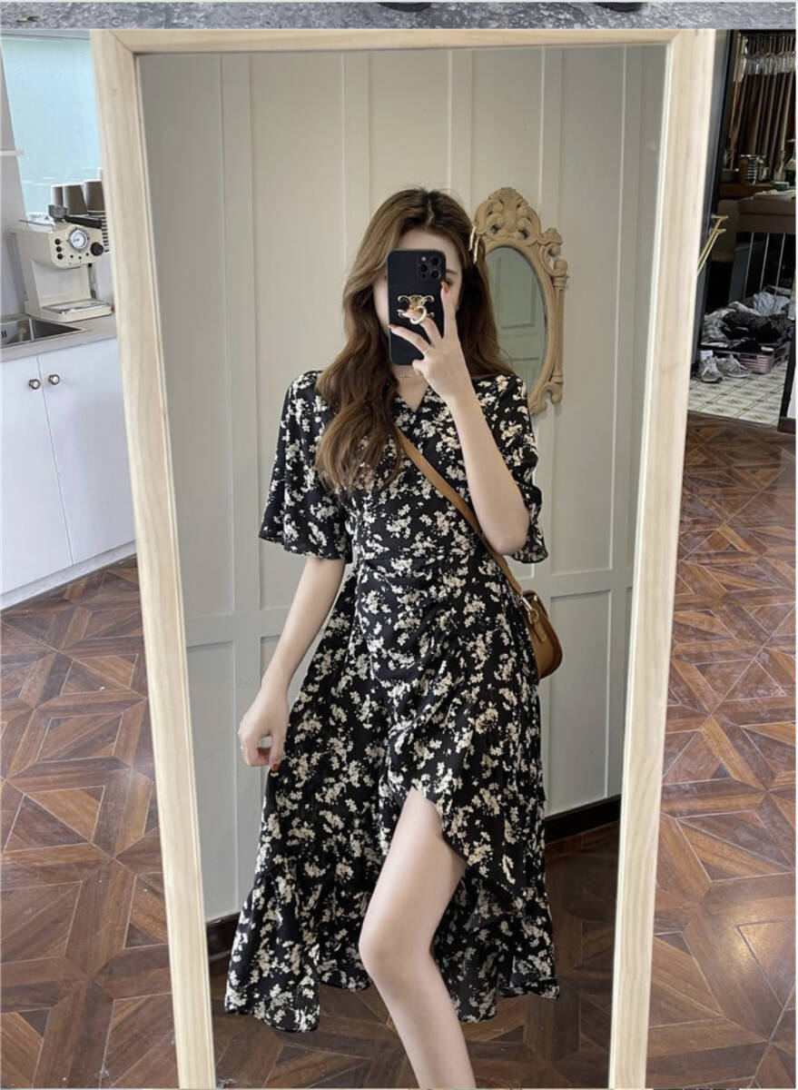 - 【新品】ワンピース 花柄 プリント ブラック 半袖 Vネック L
