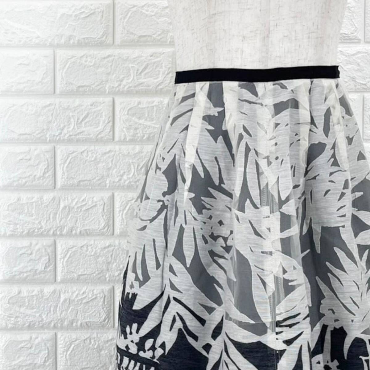 > 【A3555】UNTITLED アンタイトル スカート レディース ホワイトxブラック フレア リーフ柄 モノトーン カジュアル ひざ丈 Sサイズ