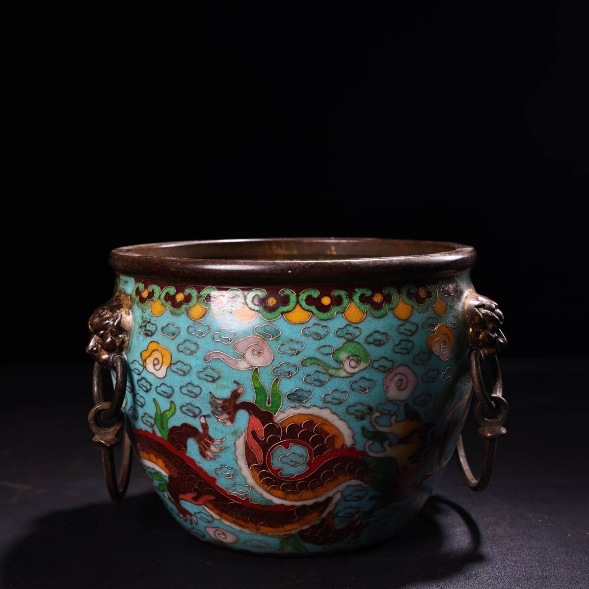 - ▽鴻▽ 銅製 景泰藍 琺瑯彩 龍鳳紋 虎頭罐 置物 古賞物 中国古玩 中国古美術