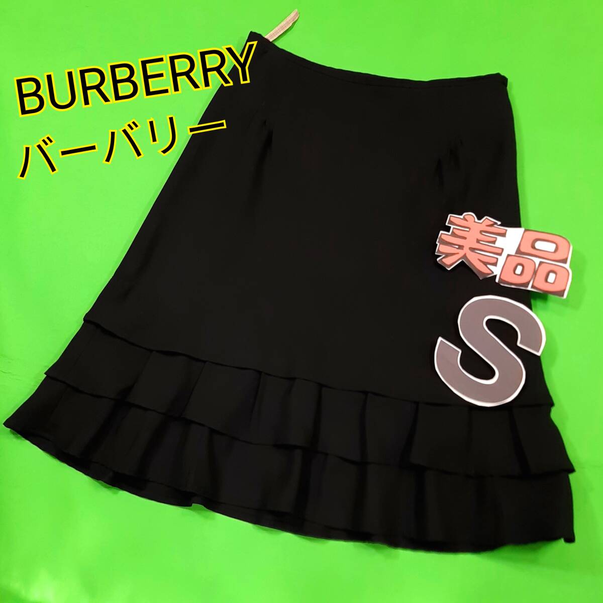 > H1美品★BURBERRY バーバリーブルーレーベル★Sサイズ 送料無料★裾フリルが可愛い 膝丈スカート セミフレアー ブラック黒 フォーマル