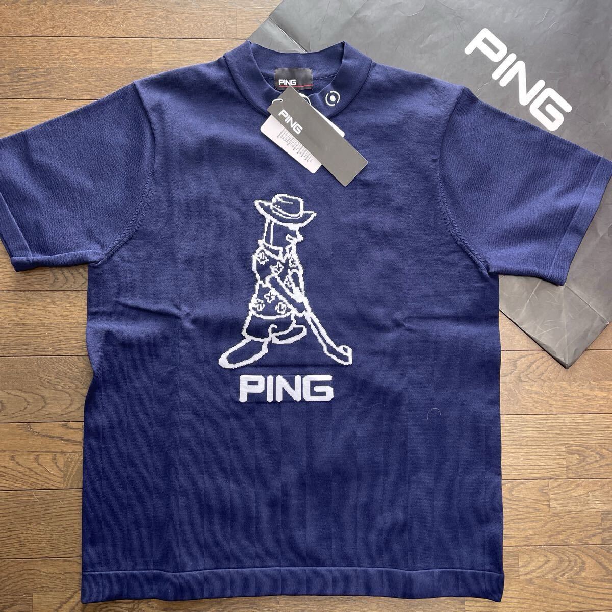 - 送料無料PING GOLFピンゴルフLADIESボトルネック半袖KNITプルオーバーBIG Mr.PING編地柄軽量速乾通気性STRETCH Navy(大特価M)新品