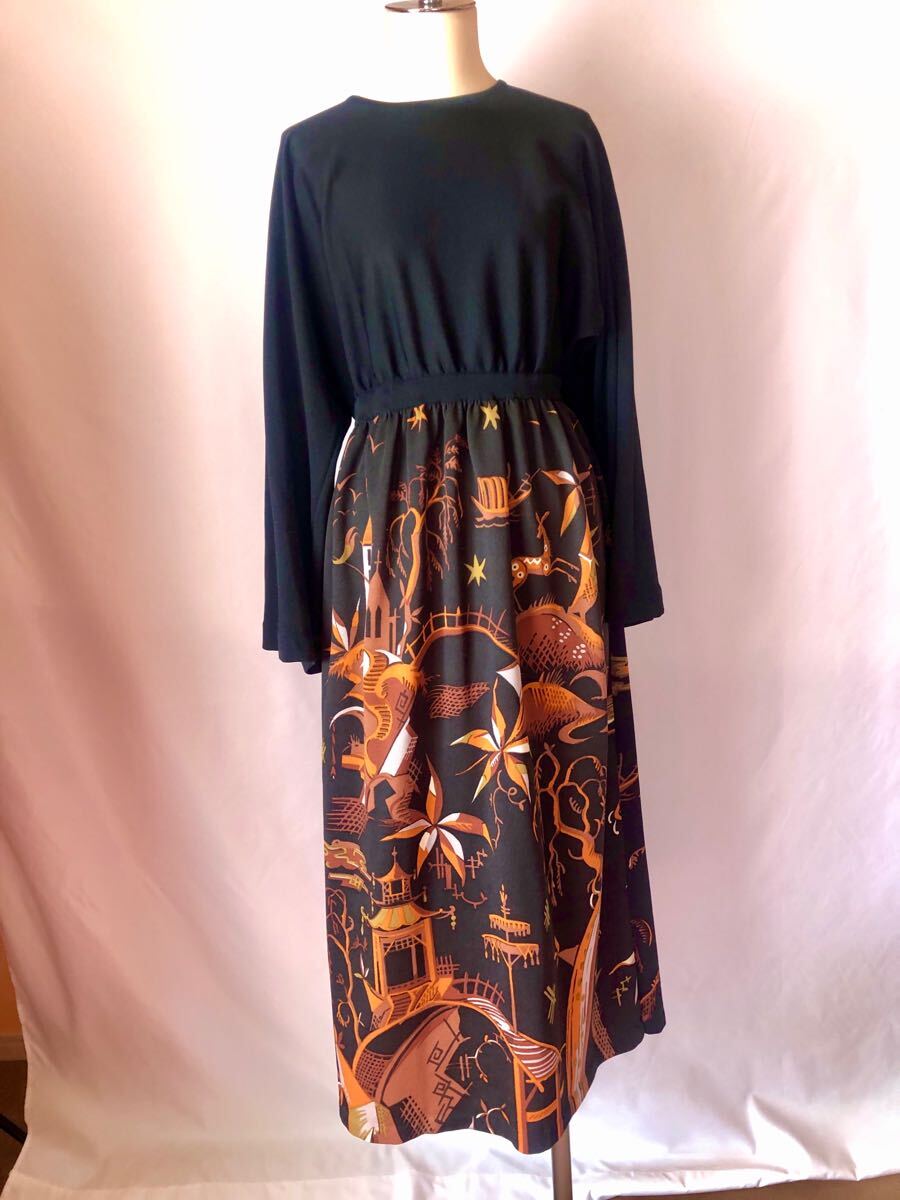 > フランスパリヴィンテージ長袖ロングワンピースM-L黒ブラックブラウンベージュ鹿がかわいい♪ストレッチ中肉地厚ジャージー素材春秋冬用