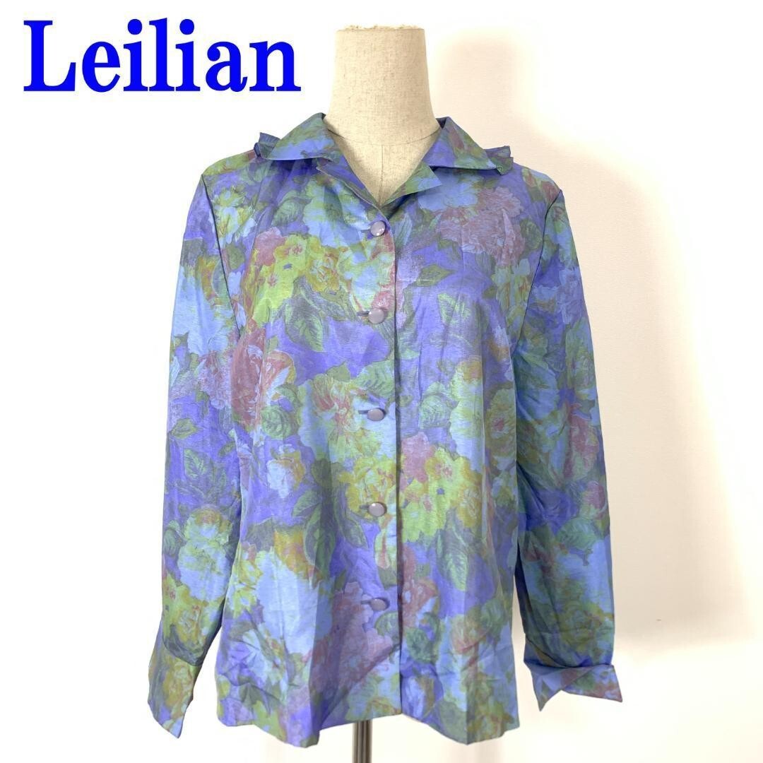 - Leilian レリアン 長袖シャツ ブルー ポリエステル 花柄シャツ 襟フリル 13 C2382