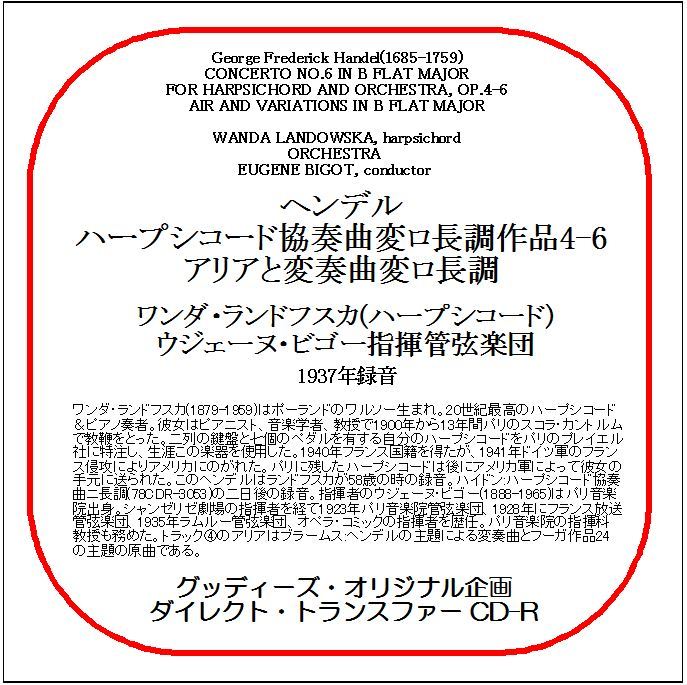 - ヘンデル:ハープシコード協奏曲/ワンダ・ランドフスカ/送料無料/ダイレクト・トランスファー CD-R
