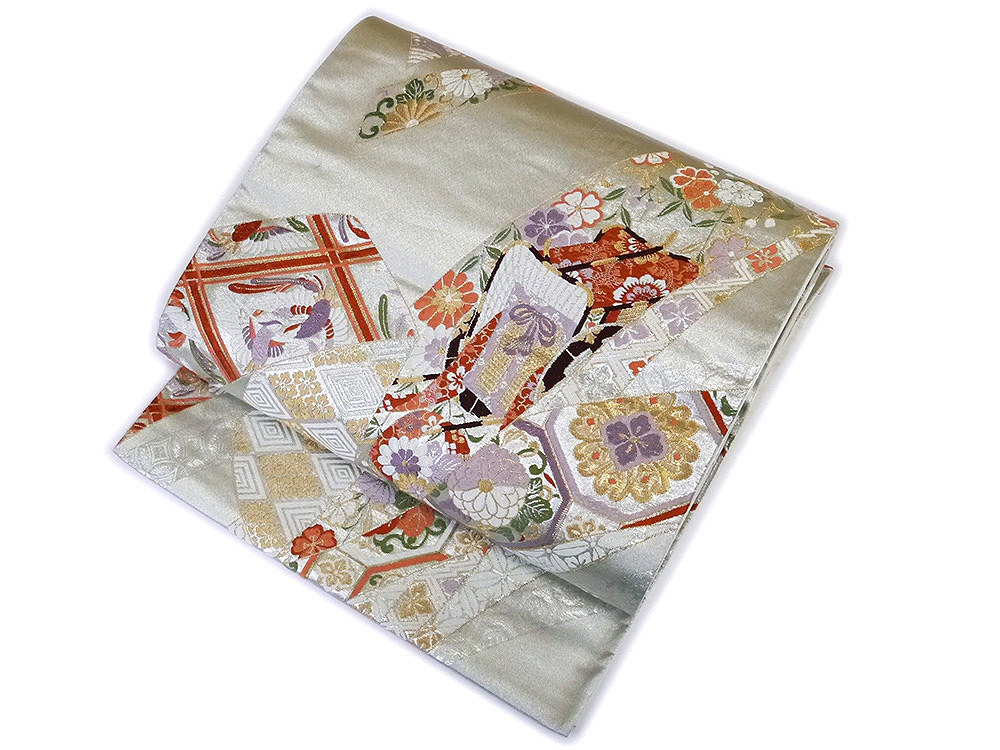 - 【京かんざし】j-476★袋帯 唐織 熨斗文 銀箔地 六通 正絹 躾糸付き 未使用★即決送料無料