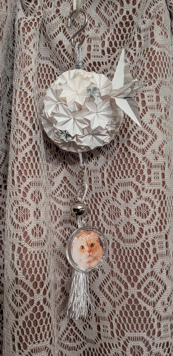 > ①鎮魂◇御弔い◇ホワイト×シルバーくす玉◇タッセル/銀鈴/フォトフレーム着脱可能♪白×銀折り鶴を差し込める♪◇差し上げ品◇メモリアル