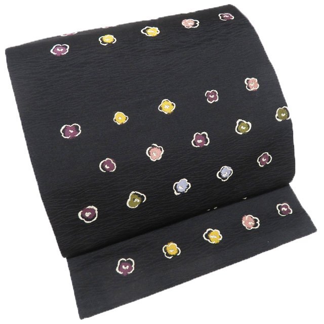 > 名古屋帯 なごや帯 中古 リサイクル 正絹 カジュアル 仕立て上がり 花模様 黒色 多色 きもの北條 A1175-16