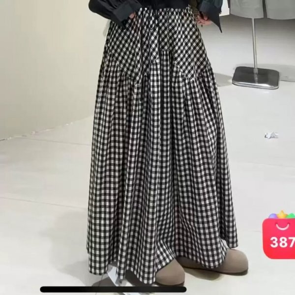 - m スカート レース ゆったり チェック柄 フリーサイズ 肌触り 通気性抜群 大人可愛 ナチュラル 楽ちん 裾広がる ブラック 綿100%