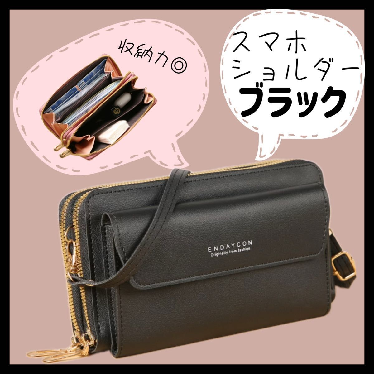 - ブラック スマホショルダー iphone ポーチ バッグ 財布 ショルダー 肩掛け ポシェット ショルダーバッグ お迎え 保育園 学童 5950