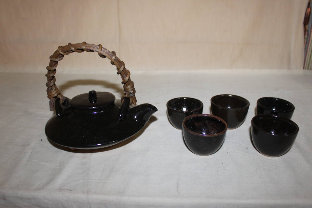 - 哲山作 苗代川焼 黒千代香 盃 5客 酒杯 銚子 酒器 共箱