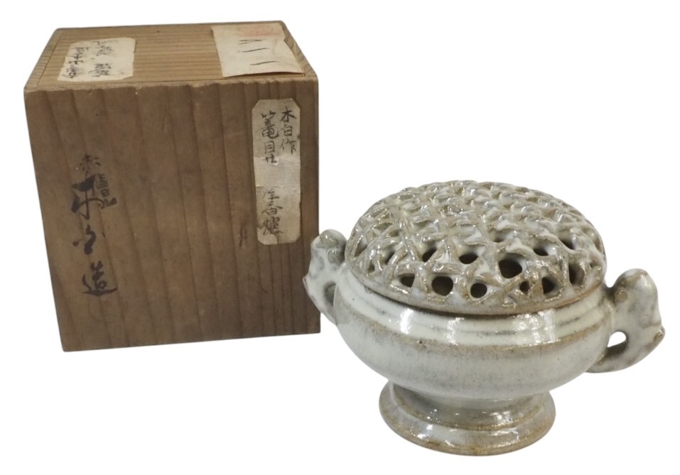 > 江戸期〜明治期 アンティーク 木白作 奥田木白 赤膚焼 籠目蓋付香炉 在銘品 共箱付 TMA704